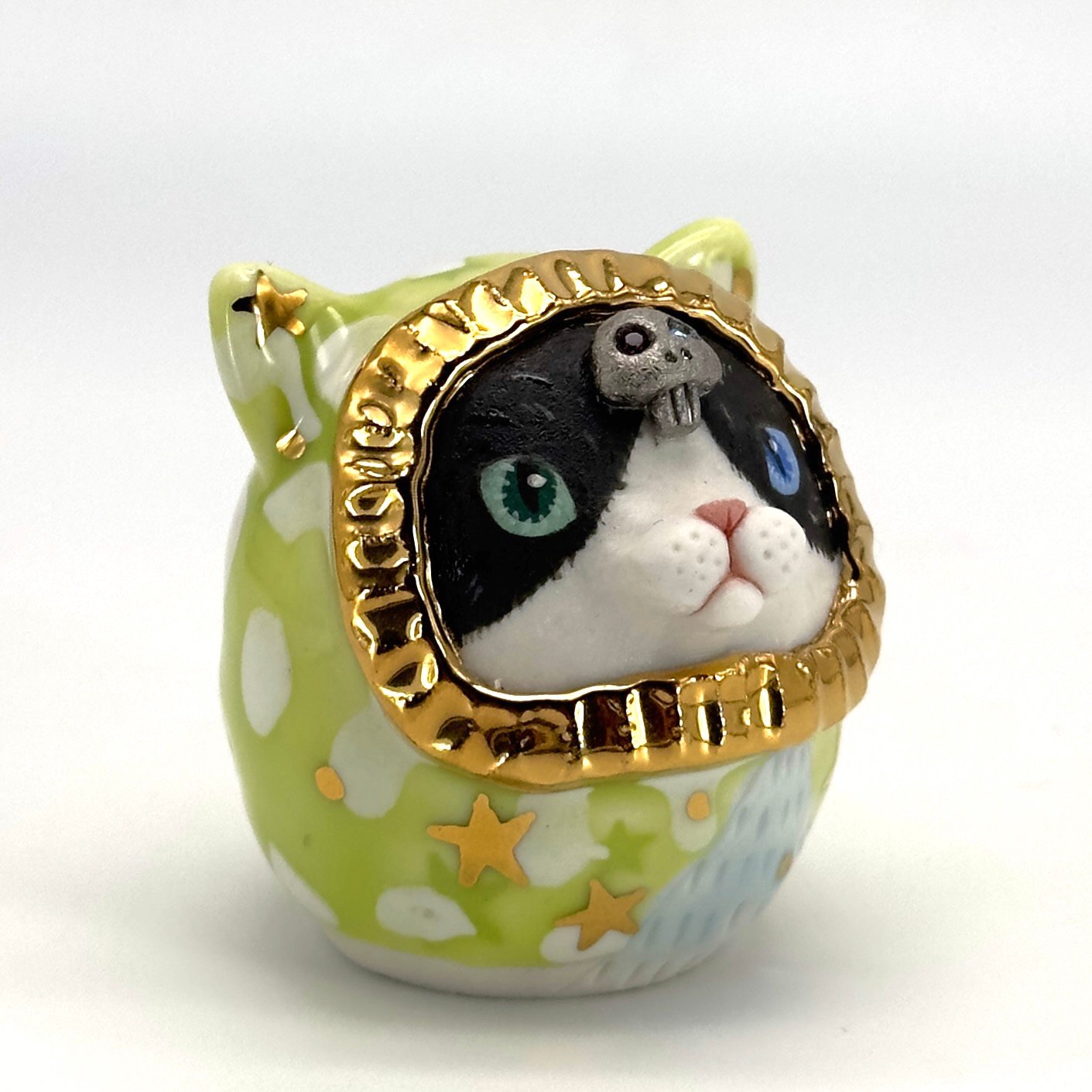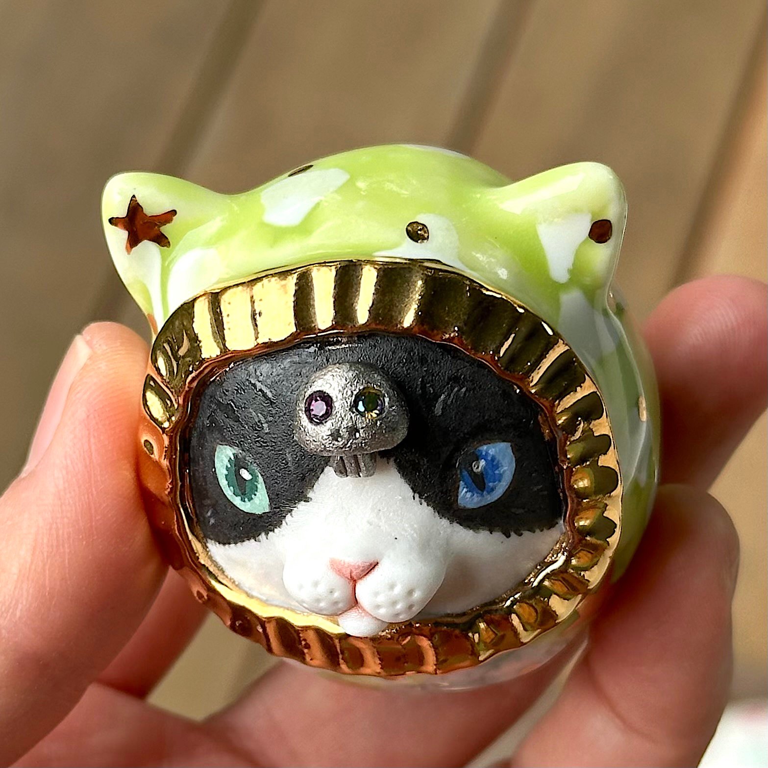 Materials: Porcelain, Glaze, Underglaze, Copper Carbonate, 22k Gold Luser, Mother of Pearl Luster, Vintage Swarovski